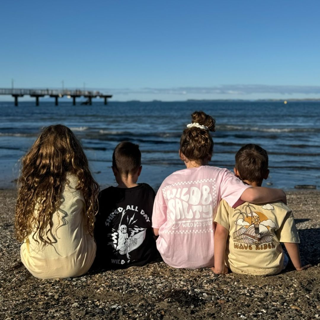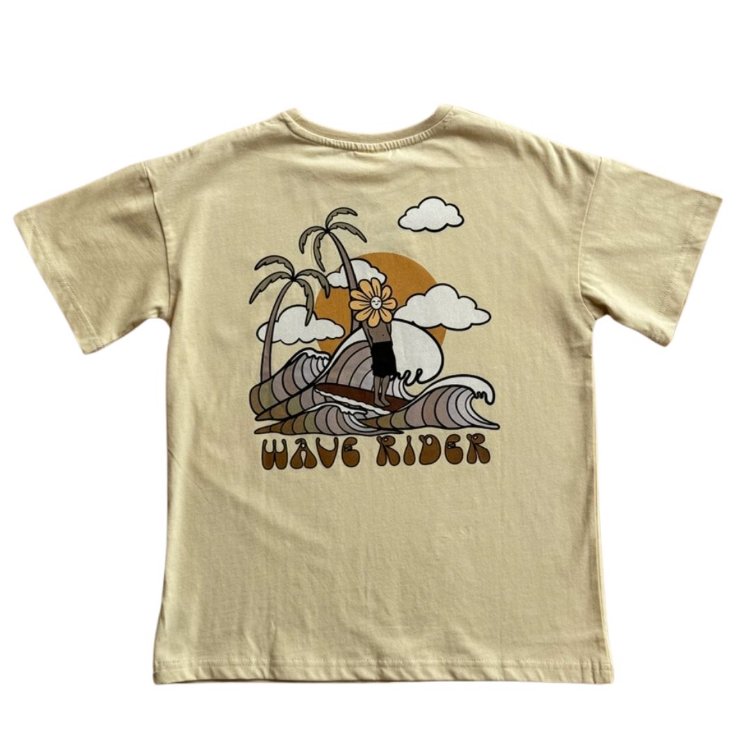 Check out our wave rider tee, this epic print is set on the perfect neutral colour to go with any of our boardies this summer.
