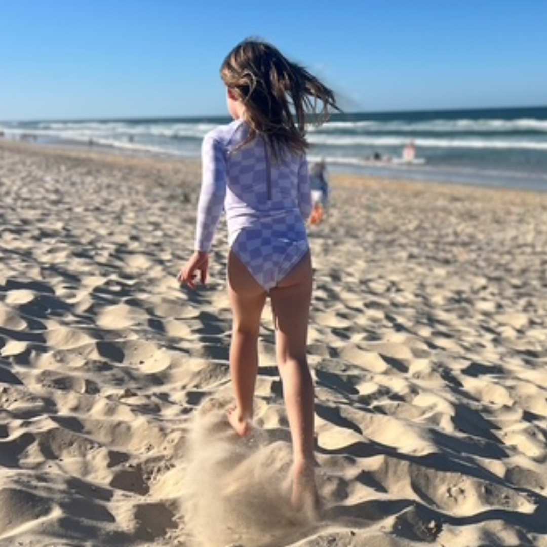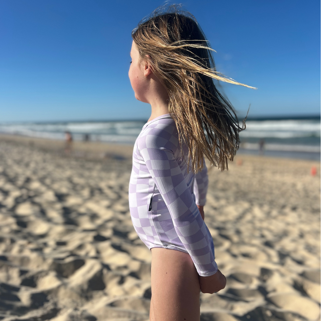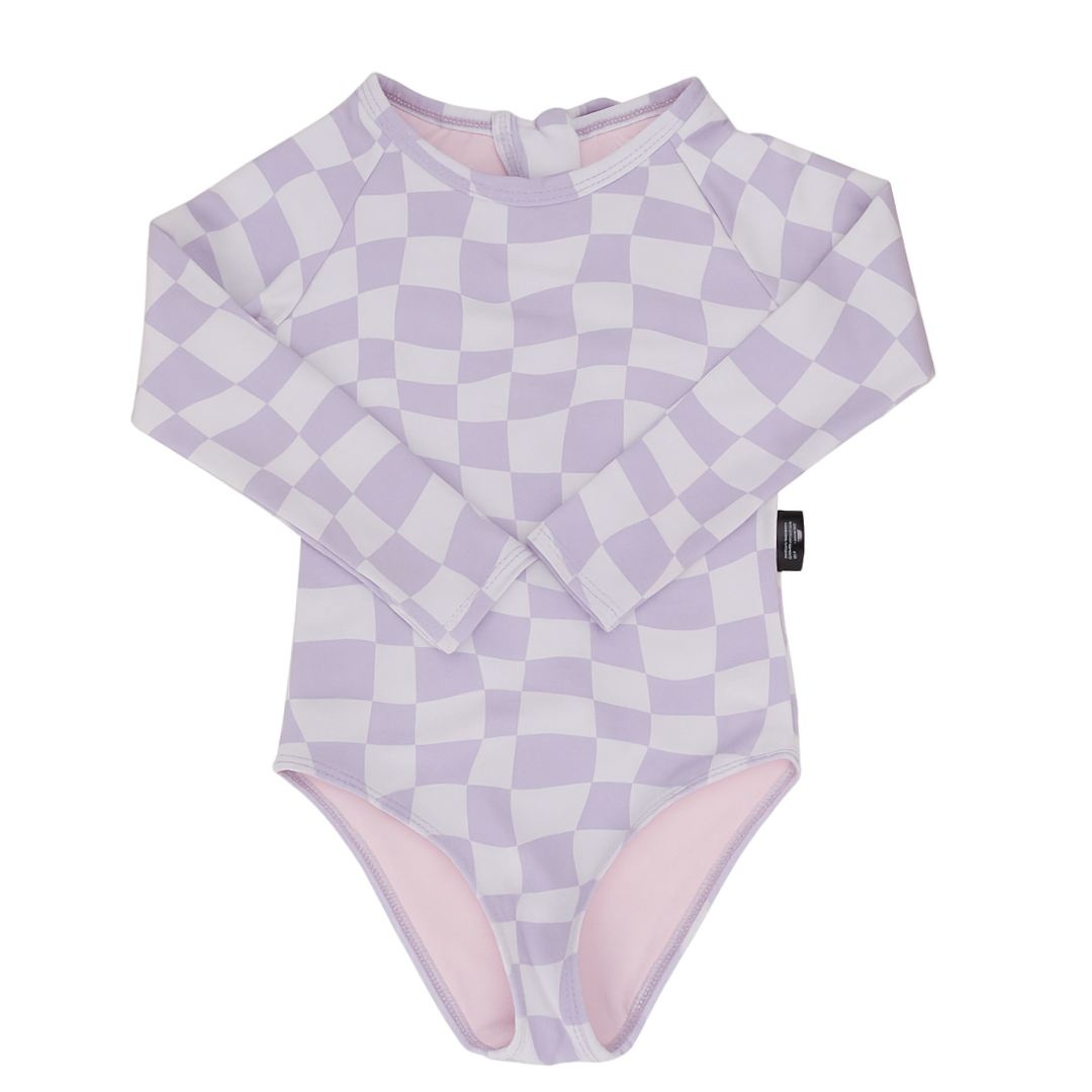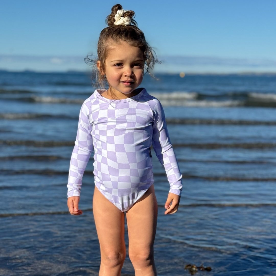This gorgeous wavy check one piece is the perfect pastel for your beach babe. Our swimwear are made using recycled material, are double lined to look and feel good!.